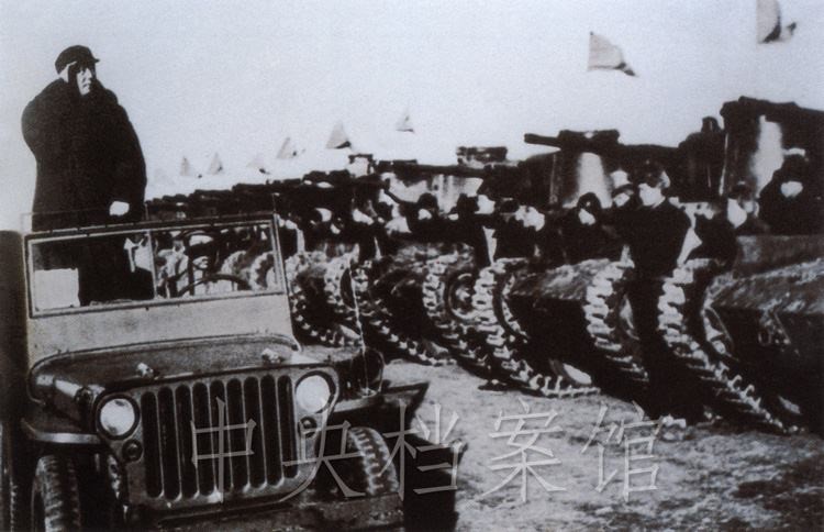 紀(jì)錄片:(群眾呼聲)中國人民萬歲?。o(jì)錄片解說)檢閱開始了。東北野戰(zhàn)軍參謀長劉亞樓將軍,向毛主席報告受檢閱的部隊全部到齊。坦克塔上飄揚著紅旗,坦克手精神百倍,向著自己的領(lǐng)袖敬禮。